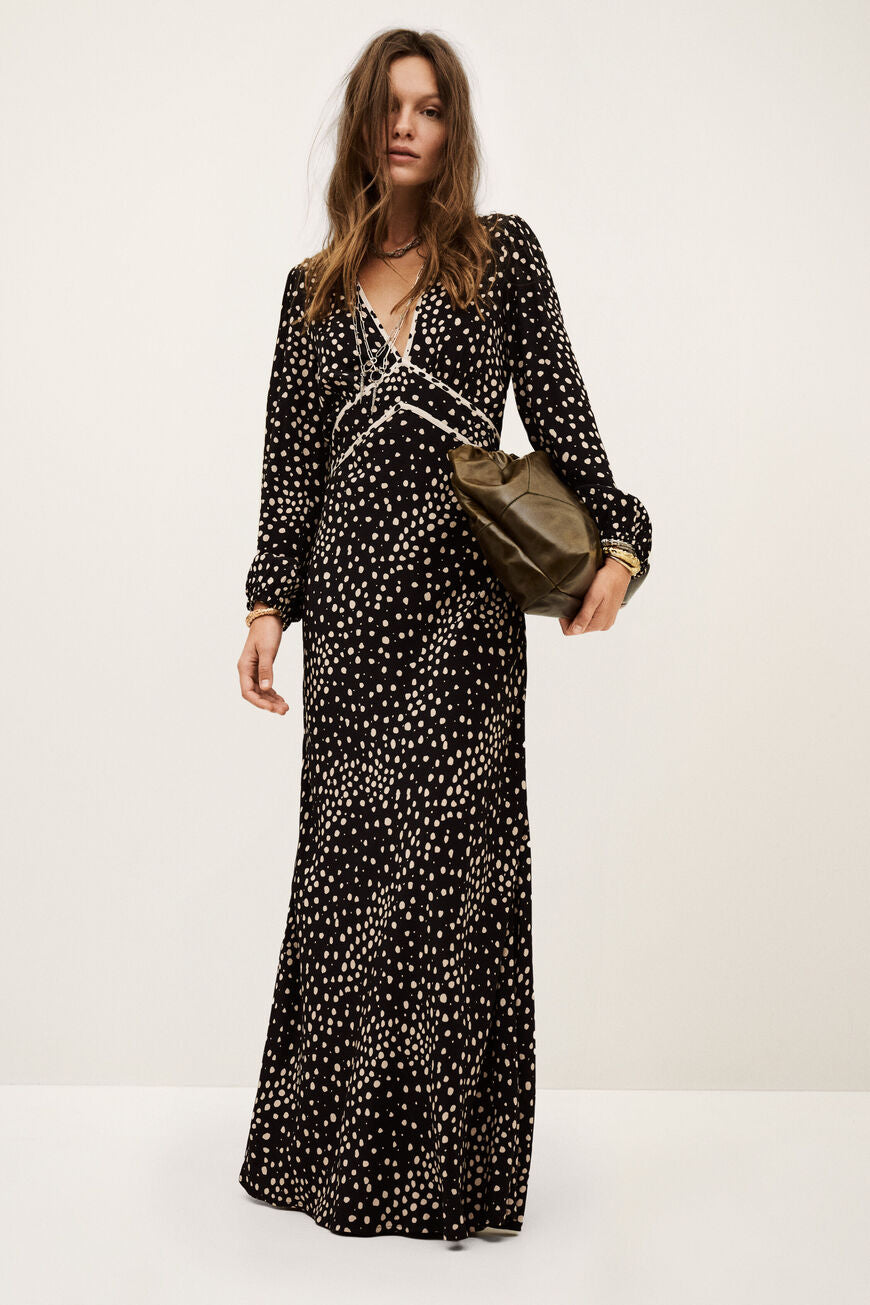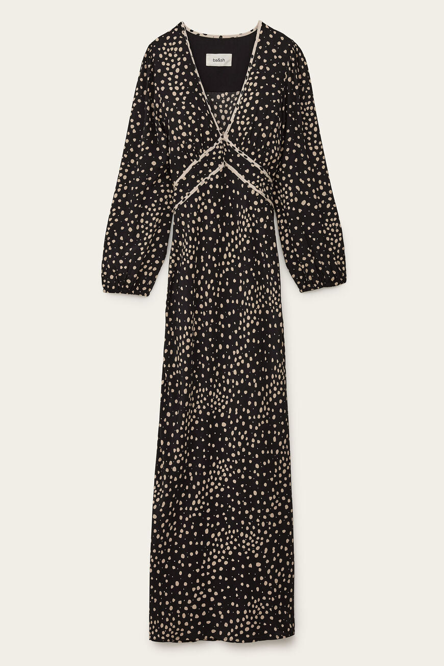 Derby Maxi Dress i Encre fra ba&sh byder på feminin elegance med et tidløst twist. Kjolen har lange puffærmer, fitted talje og V-udskæring, med kontrastdetaljer på skuldre og front, der giver kant til det sarte mønster. Maxi længden giver et flydende og romantisk udtryk, som fremhæver dine ben og lægger vægt på silhuetten.
