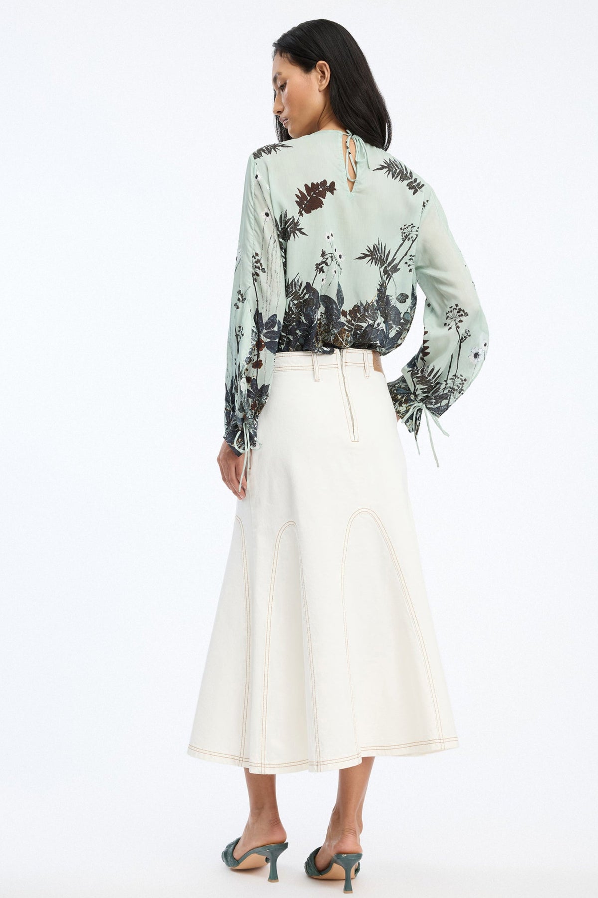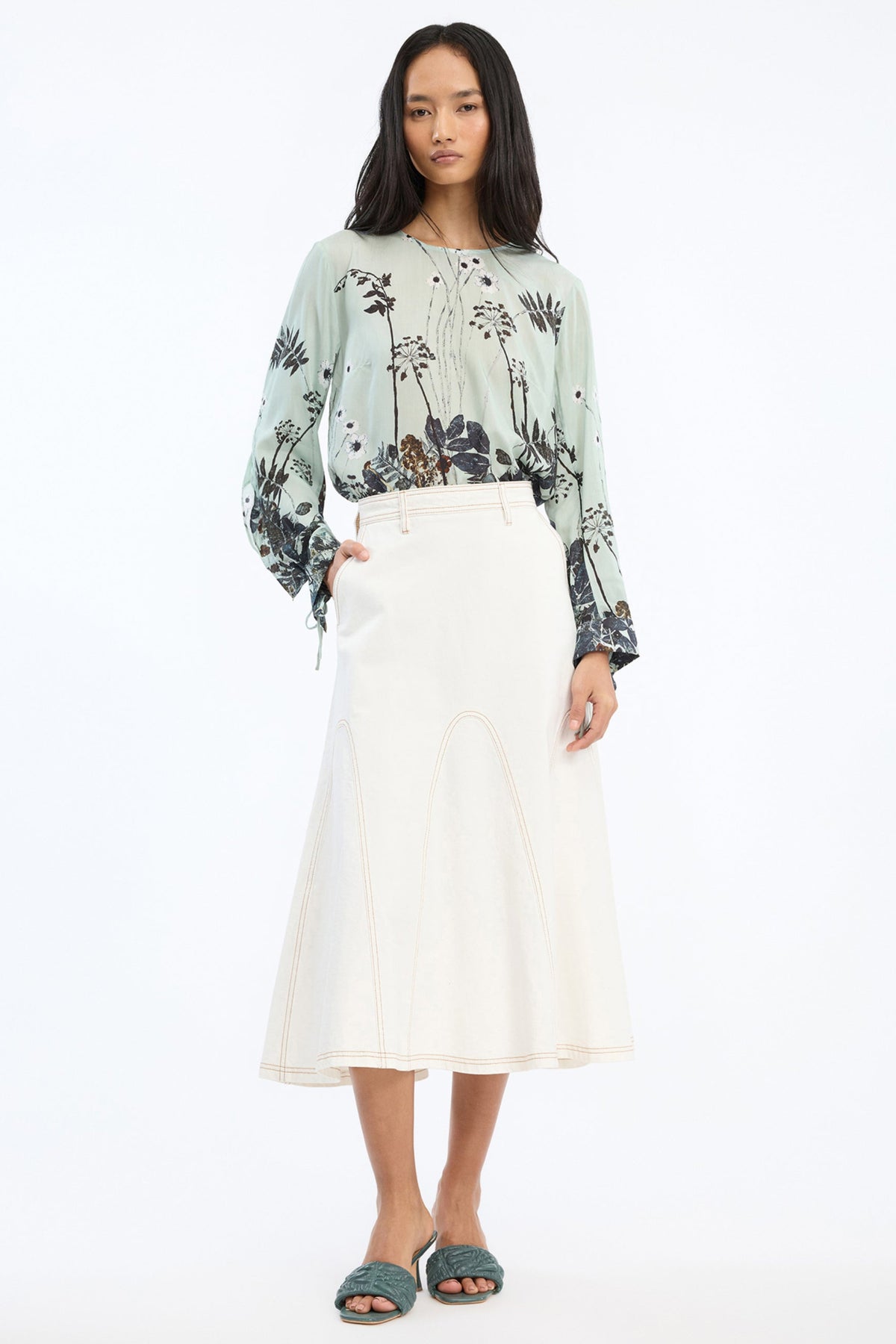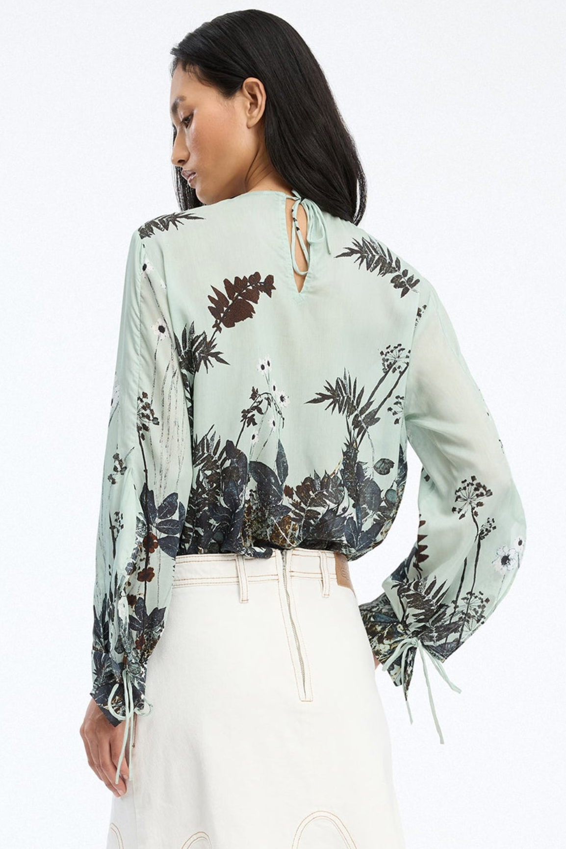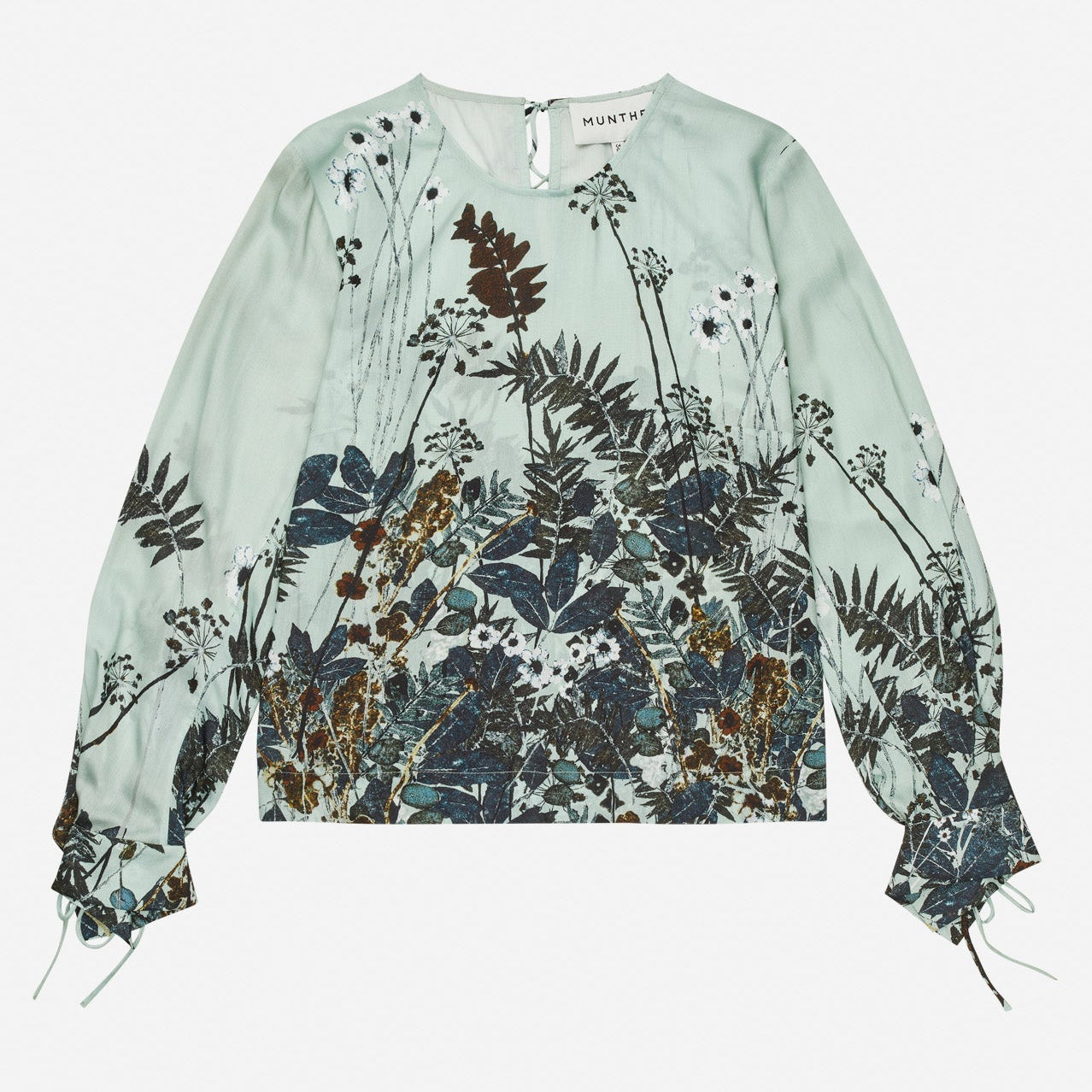 Basilia Top fra Munthe er en elegant og feminin top med et flerfarvet botanisk print i mint-nuancer, som tilfører en frisk og livlig stemning til dit outfit. Den har lange ærmer med små bindedetaljer ved håndleddene, der skaber et subtilt, dekorativt look.