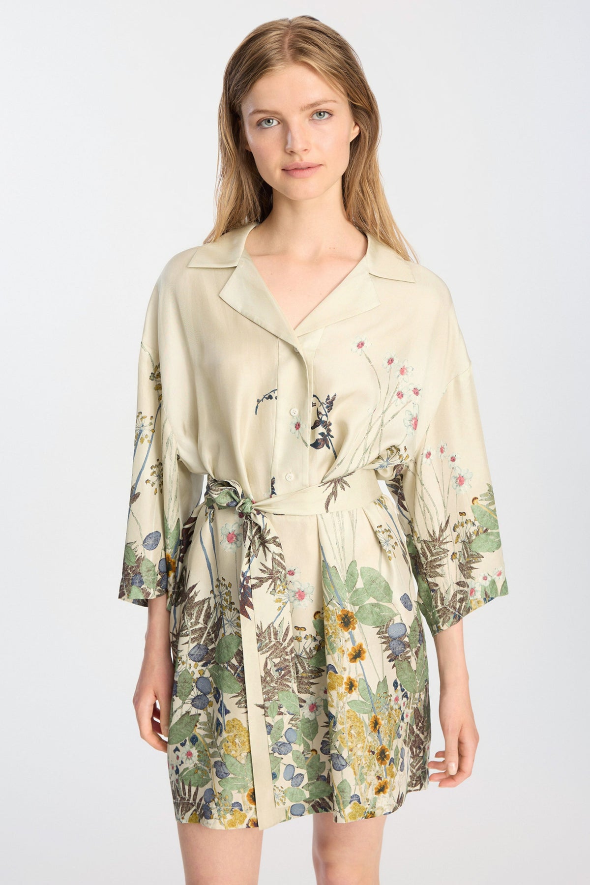 Designet har korte ærmer, en klassisk skjortekrave og et bælte i taljen, som giver mulighed for at fremhæve figuren. Det botaniske print skaber et feminint og levende udtryk, som løfter kjolens stil.