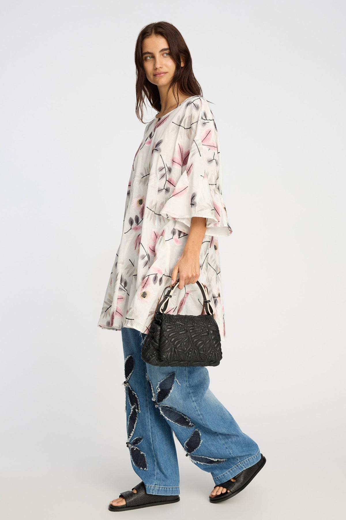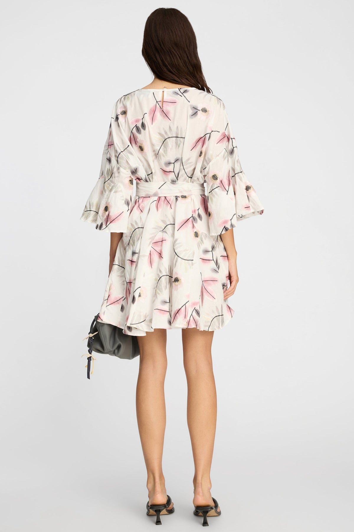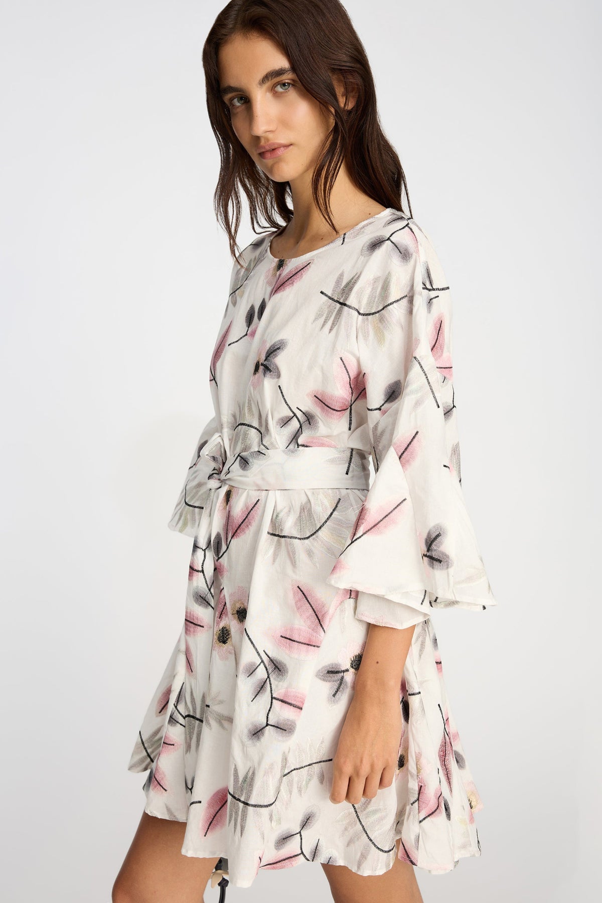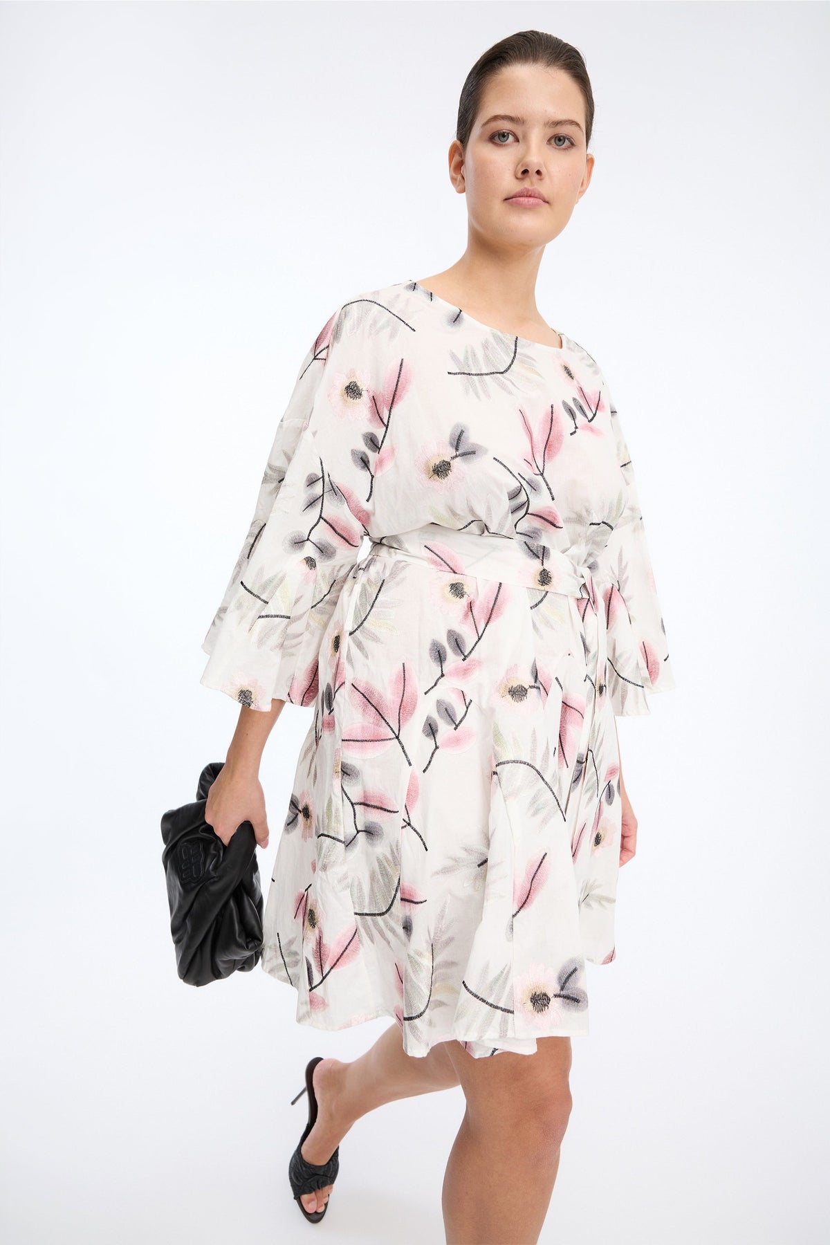 Kjolen har en løs silhuet med korte, let svajede ærmer, som giver et feminint og afslappet udtryk. Det medfølgende bindebælte gør det muligt at fremhæve taljen og tilpasse pasformen. Hver kjole er unik i sit print, hvilket giver et eksklusivt og personligt touch. Perfekt til både hverdag og fest.