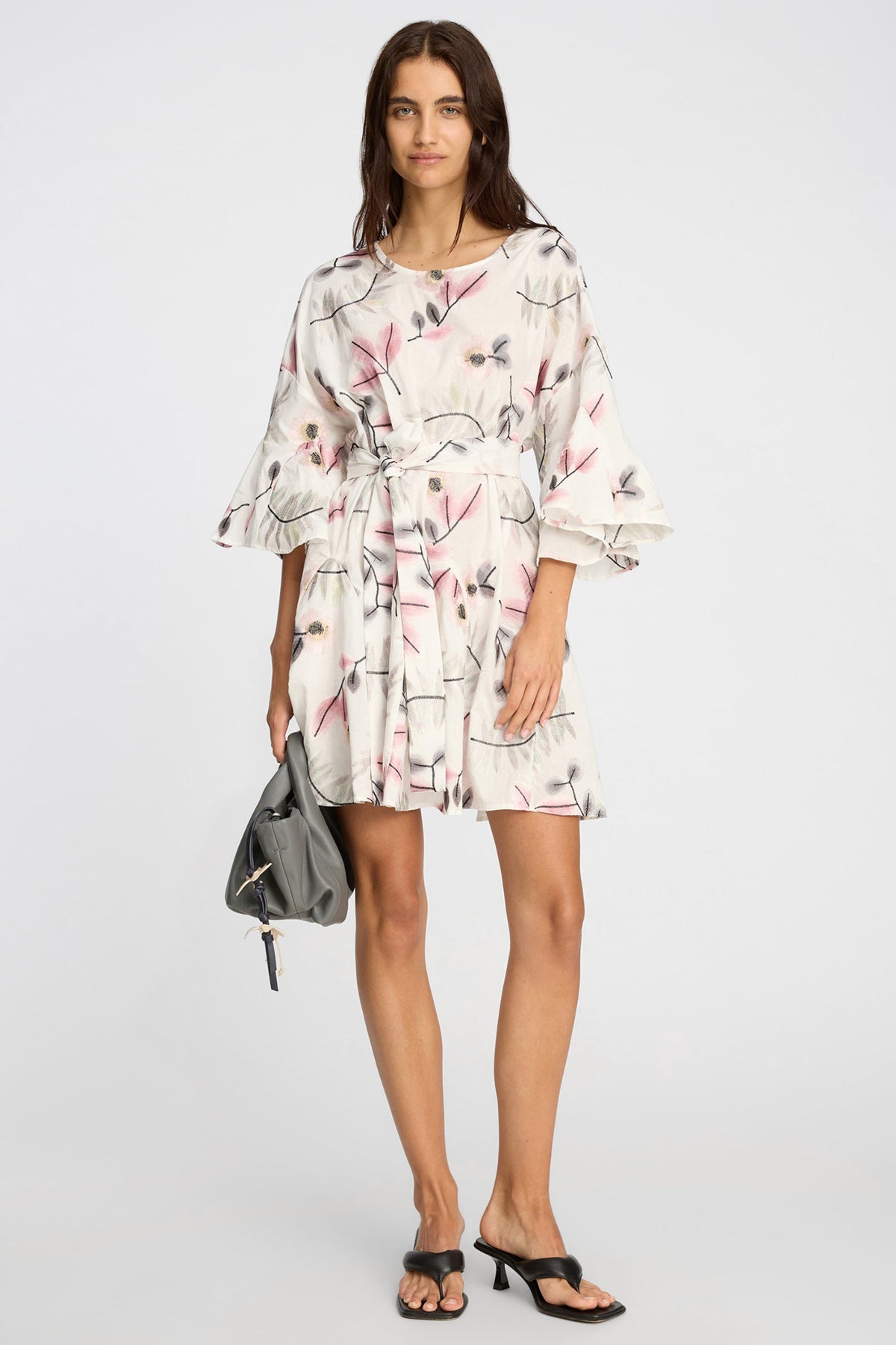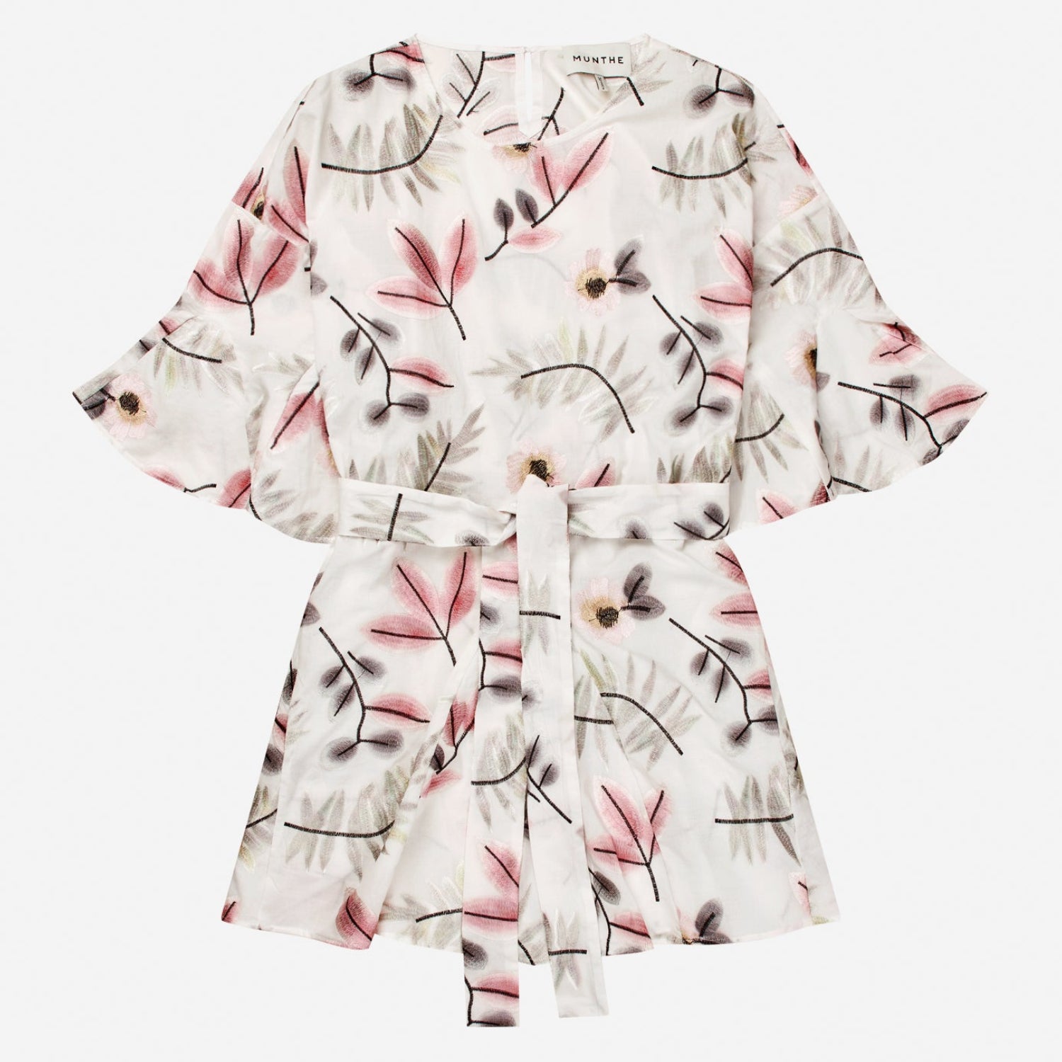 Munthe Blaydon kjole i Print Kit med botanisk print, løs pasform, korte ærmer og bindebælte.