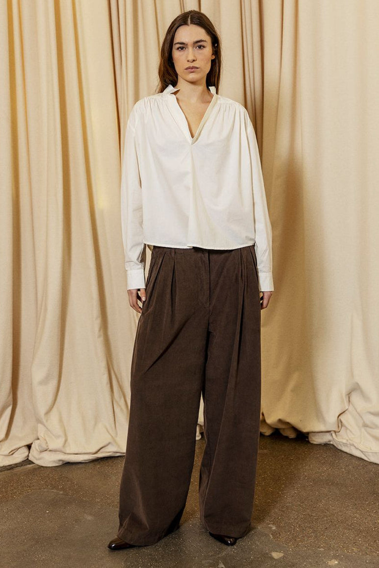 Tailor Bukser fra Project AJ117 er et par brede bukser fremstillet i blød baby-corduroy, der kombinerer struktur med komfort. Bukserne har for-pliéer, to stiklommer foran og klassisk lynlås- og knaplukning, hvilket skaber en sofistikeret silhuet.