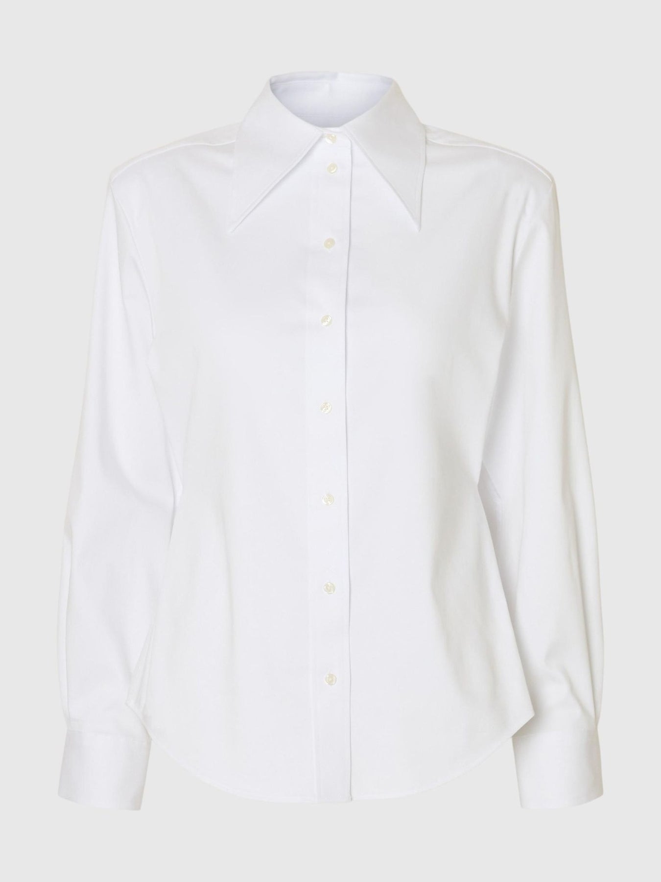 Selected Femme slim fit skjorte i bright white med spids krave, knaplukning og lange ærmer i økologisk bomuldsblanding.